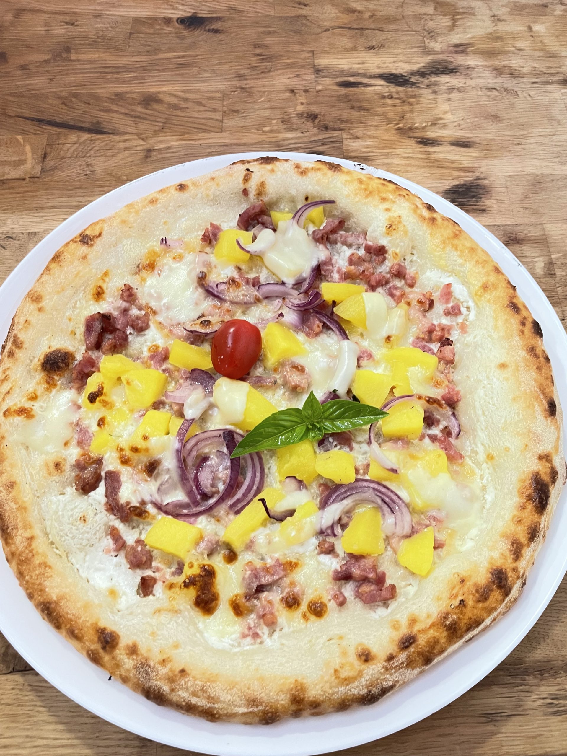 Sauce tomate, mozzarella, bacon, oignons, oeuf, cheddar